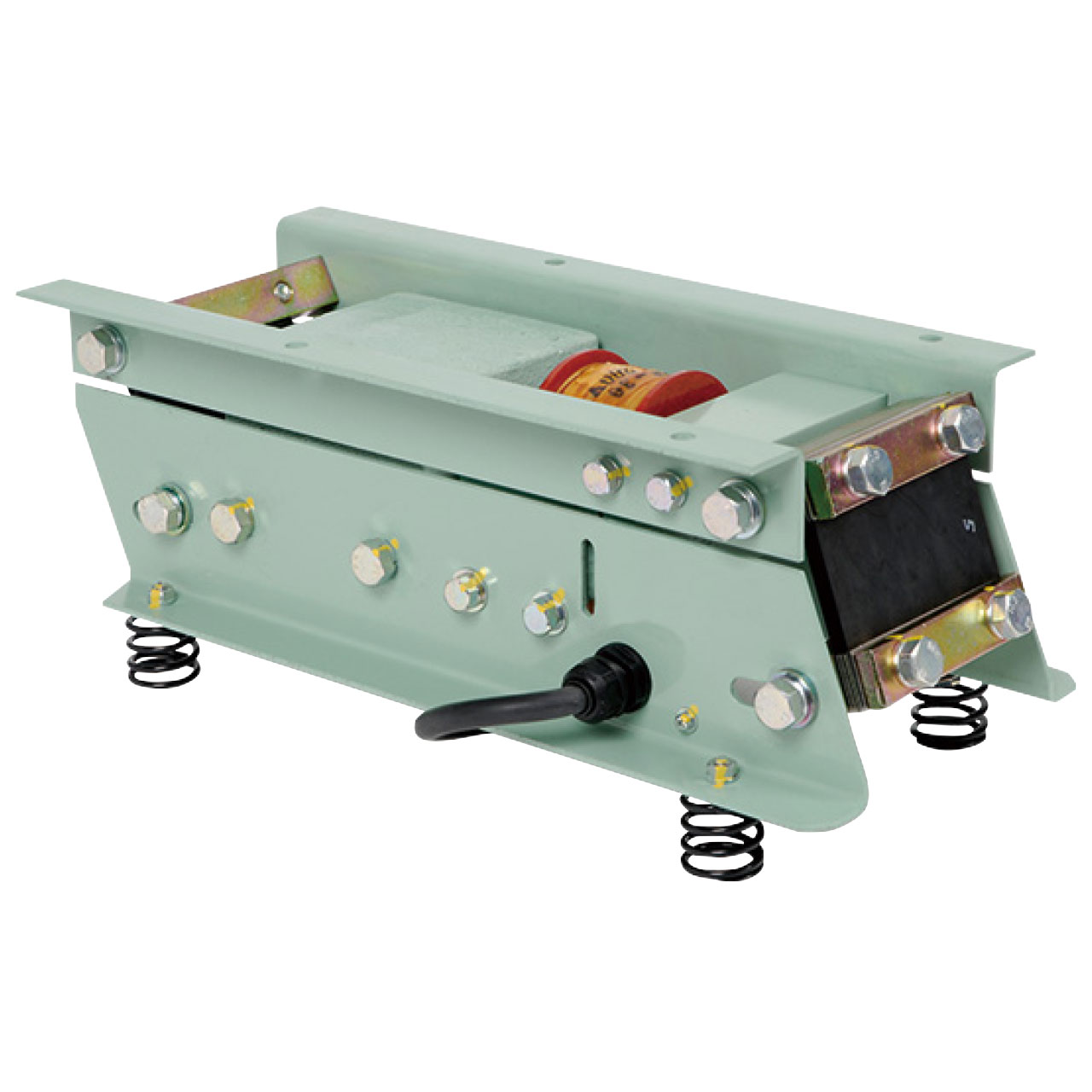 Large-capacity electromagnetic drive unit has strong coil springs positioned at front and rear, and drive controlled by amplitude angle adjustment, to give speedy, steady, straight-line delivery of large-sized workpieces. The low-floored half-wave drive provides uniform amplitude and vibration frequency to eliminate irregularities during high-volume conveyance of large workpieces.