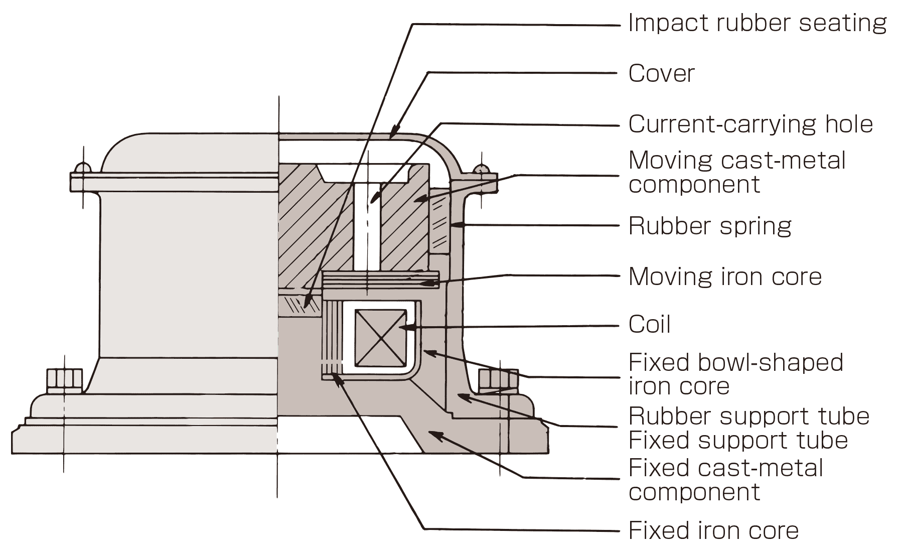 This model combines a movable casting and a rubber spring with strong repulsive force, which vibrates by electromagnetic force caused by AC half-wave pulsating current. Suitable for medium-capacity hoppers, compact, lightweight, and easy to install. Moreover, it is an economical type with low power consumption. The rubber spring is highly durable and can be used at temperatures from -60°C to -15°C.